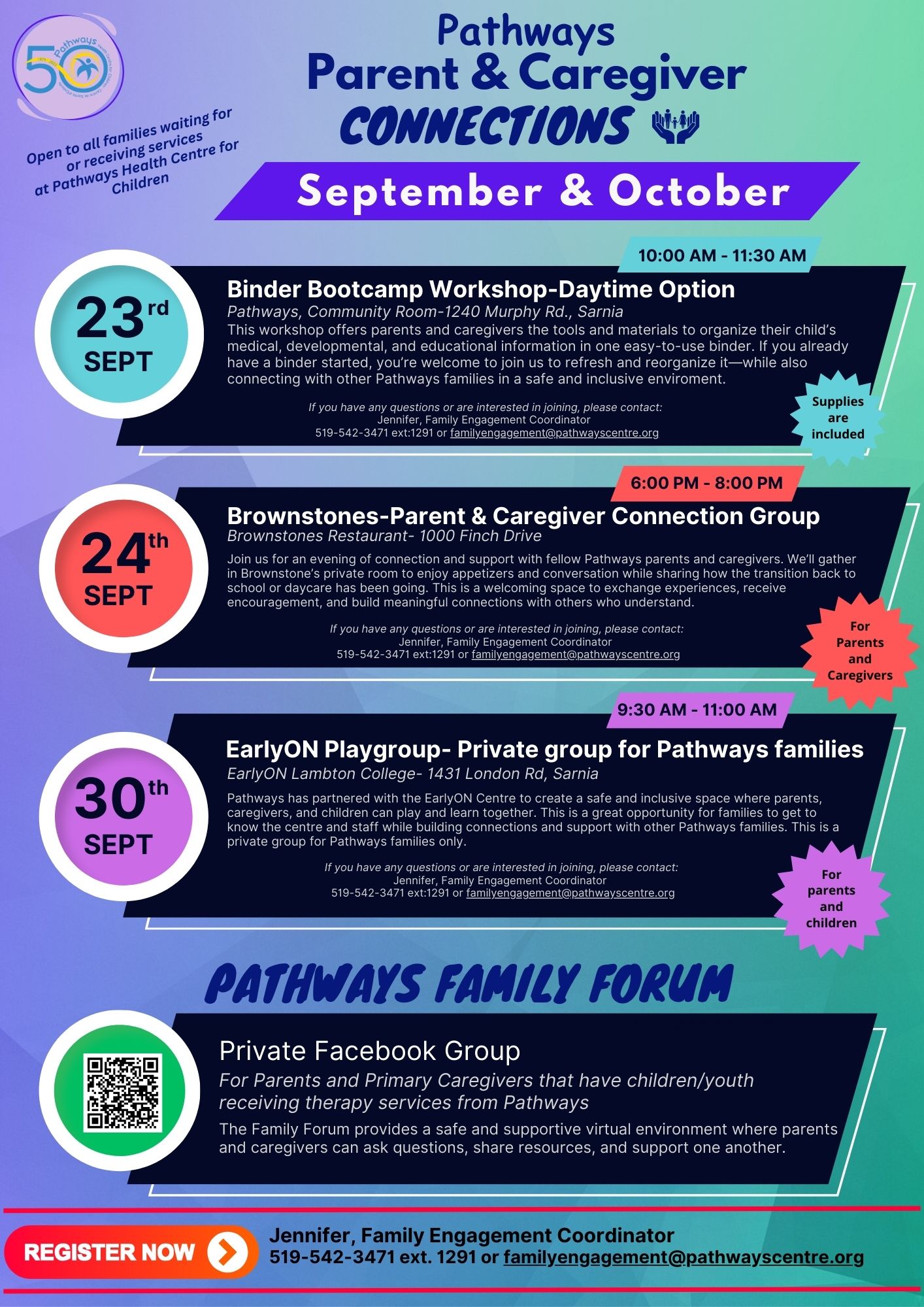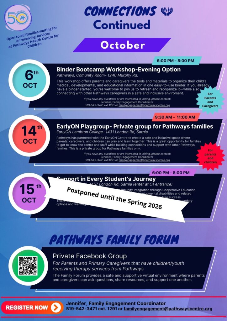 We’re excited to share some upcoming Family Engagement events happening in September and October! These gatherings are designed for Pathways parents and caregivers to connect, share experiences, and lean on one another for support in a safe and welcoming space. If you’re interested in joining any of these events, please reach out to our Family Engagement Coordinator at 519-542-3471 ext:1291 or familyengagement@pathwayscentre.org